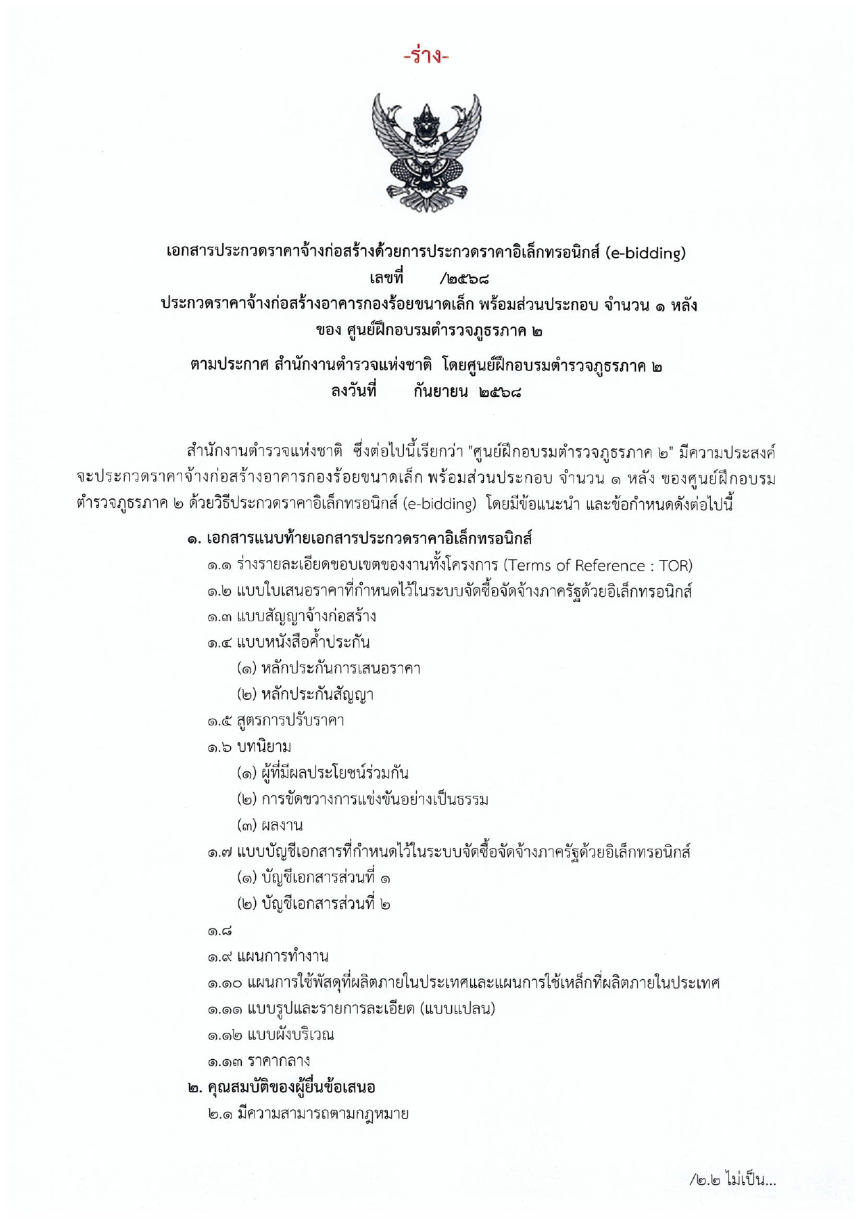 ร่างประกาศ เอกสารประกวดราคาจ้างก่อสร้างอาคารกองร้อยขนาดเล็ก พร้อมส่วนประกอบ จำนวน 1 หลัง ของ ศฝร.ภ.2