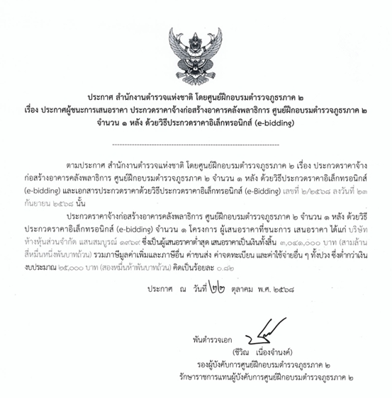 ประกาศผู้ชนะเสนอราคา ประกวดราคาจ้างก่อสร้างอาคารคลังพลาธิการ ศฝร.ภ.2 จำนวน 1 หลัง ด้วยวิธีประกวดราคาอิเล็กทรอนิกส์ (e-bidding)