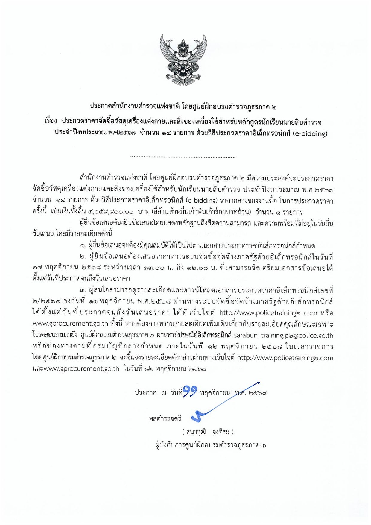 ประกวดราคาจัดซื้อวัสดุเครื่องกายและสิ่งของเครื่องใช้สำหรับหลักสูตร นสต. ประจำปีงบประมาณ พ.ศ.2567 จำนวน 14 รายการ ด้วยวิธี (E-bidding)