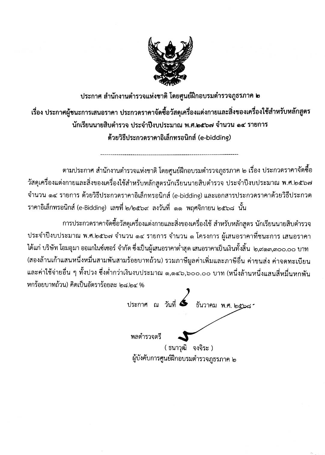 ประกาศผู้ชนะการเสนอราคา ประกวดราคาจัดซื้อวัสดุเครื่องแต่งกายและสิ่งของเครื่องใช้สำหรับจัดซื้อวัสดุเครื่องแต่งกายและสิ่งของเครื่องใช้สำหรับหลักสูตร นสต. ประจำปีงบประมาณ 2567 จำนวน 14 รายการ ( E-bidding)