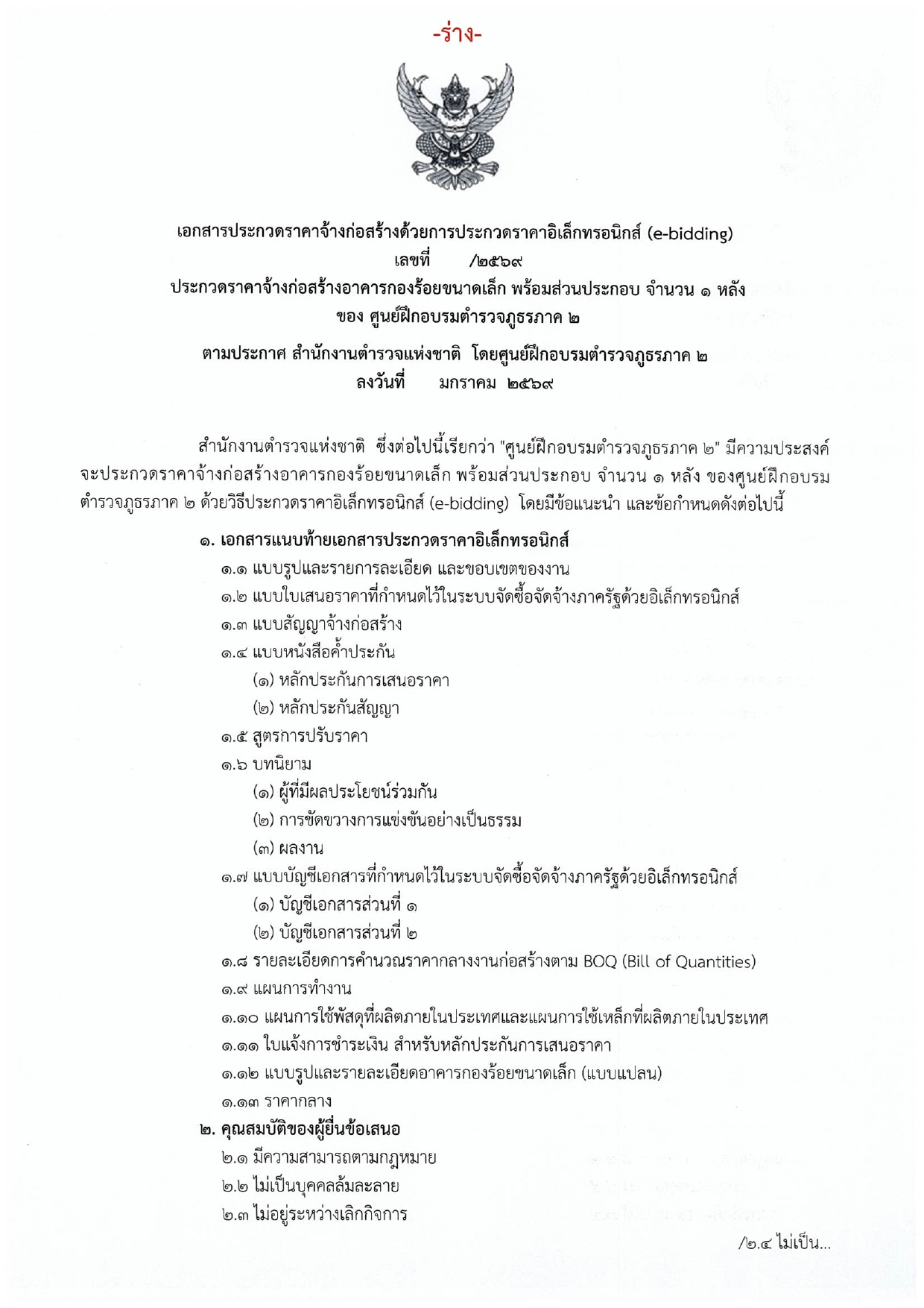 ประกวดราคาจ้างก่อสร้างอาคารกองร้อยขนาดเล็ก พร้อมส่วนประกอบ จำนวน 1 หลัง ของ ศฝร.ภ.2 ด้วยวิธีประกวดราคาอิเล็กทรอนิกส์ (e-bidding)