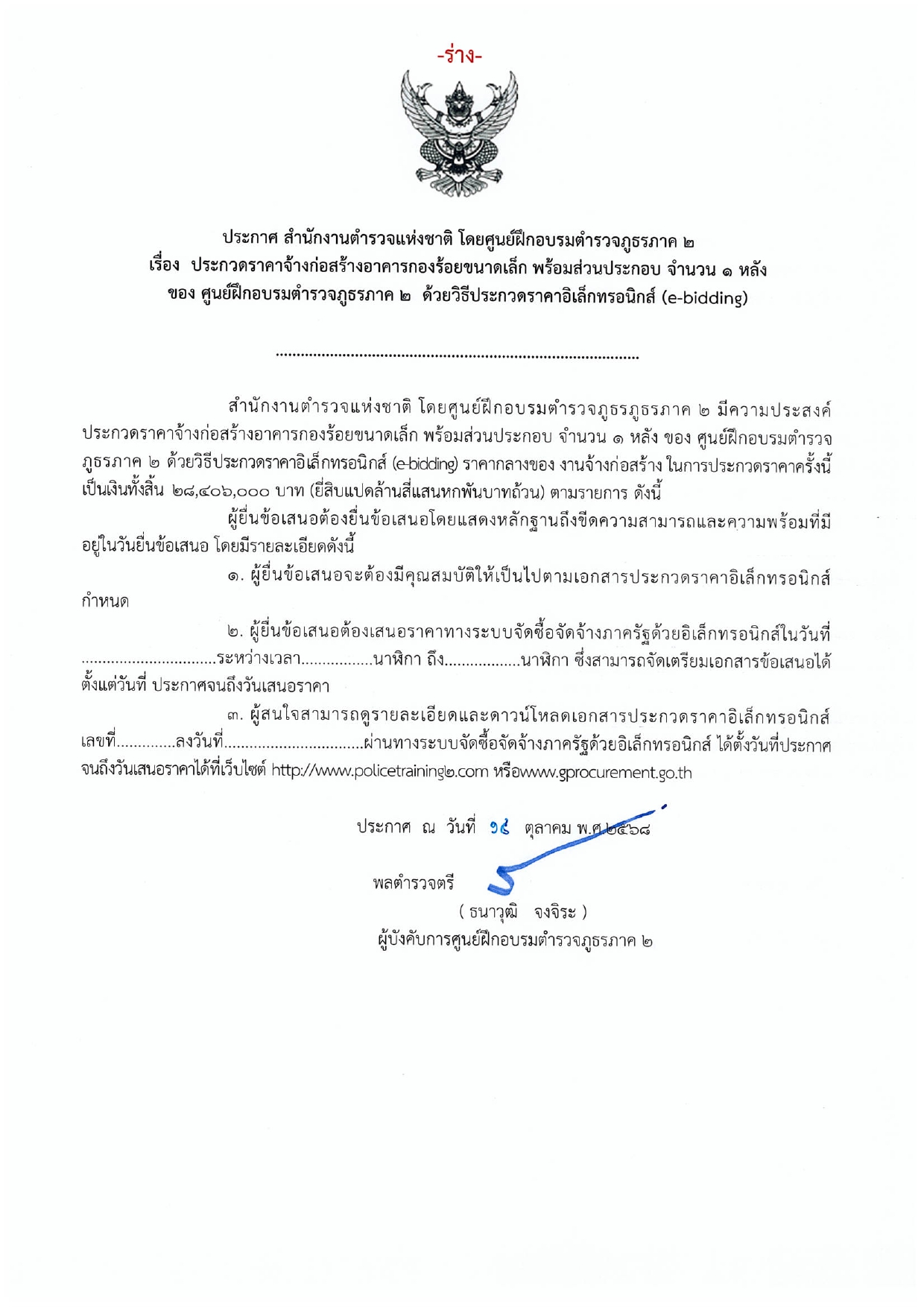 (ร่าง) ประกวดราคาจ้างก่อสร้างอาคารกองร้อยขนาดเล็ก พร้อมส่วนประกอบ จำนวน 1 หลัง ของ ศฝร.ภ.2 ด้วยวิธีประกวดราคาอิเล็กทรอนิกส์ (e-bidding)